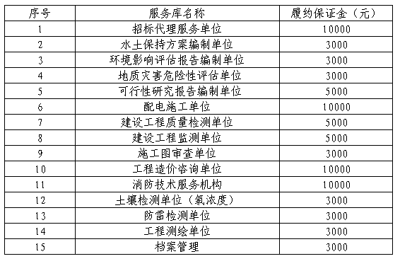 南平绿发集团有限公司因经营需要,拟成立服务库,现实施2023年服务库招录,本次招录合作期三年,要求如下: 一、本次招录类别及资格条件 本次共招录15个类别服务库,绿发集团及下属公司在今后的工作中,在不违反有关法律、法规规定的前提下,结合集团服务库管理办法,从服务库中选择具体的服务单位。满足资格的南平市市属国企单位可直接入库,入库的南平市市属国企单位家数包含在对应服务库家数内。若入围家数少于3家不能形成有效竟争的,集团公司将从库外另行再邀请相应服务单位参与比选。本次具体类别及资格条件要求如下: 1. 招标代理服务单位(10家) 具备提供工程招标代理服务的企业法人单位。且根据《闽建筑函[2018]26号》的规定投录人应当取得公司法人《营业执照》(登记营业范围须包含工程招标代理业务)且完成并通过福建省住房和城乡建设政务服务系统登记企业基本信息。(提供营业执照复印件加盖公章、福建省住房和城乡建设政务服务系统登记证明材料加盖公章) 2. 水土保持方案编制单位(5家) 具备建设项目水土保持方案编制水平评价证书 1星及以上资质。(提供营业执照和资质证书复印件加盖公章) 3. 环境影响评估报告编制单位(5家) 具备环境影响评估报告编制能力,且在环境影响评价信用平台登记的单位。同时不得被列入《建设项目环境影响报告书(表)编制监督管理办法》规定的限期整改名单、环境影响评价失信“黑名单”。(提供环境影响评价信用平台登记证明材料加盖公章、未被列入限期整改名单和环境影响评价失信“黑名单的证明材料) 4. 地质灾害危险性评估单位(5家) 具备自然资源主管部门颁发的乙级及以上地质灾害危险性评估单位资质。(提供营业执照和资质证书复印件加盖公章) 5. 可行性研究报告编制单位(6家) 具备可行性研究报告编制能力,且应是通过全国投资项目在线审批监管平台备案的工程咨询单位(建筑工程、市政公用工程)专业。(提供通过全国投资项目在线审批监管平台备案相关信息截图、营业执照复印件、资质证书复印件加盖公章) 6. 配电施工单位(5家) 具备建设行政主管部门颁发的电力工程施工总承包或送变电工程专业承包三级及以上资质,并已通过南平电业局入网审查。(提供资质证书复印件、通过南平电业局入网审查证明材料加盖公章) 7. 建设工程质量检测单位(6家) 具备建设行政主管部门颁发的建设工程质量检测资质。(提供营业执照复印件和资质证书复印件加盖公章) 8. 建设工程监测单位(6家) 具备建设行政主管部门核发的合格有效的工程勘察专业类(岩土工程物探测试检测监测)乙级及以上资质或工程勘察综合甲级资质。(提供营业执照复印件和资质证书复印件加盖公章) 9. 施工图审查单位(5家) 具备建设行政主管部门颁发的二类及以上施工图审查资质证书。(提供营业执照复印件和资质证书复印件加盖公章) 10.工程造价咨询单位(6家) 具备提供工程造价咨询服务的企业法人单位。且根据《闽建筑函[2021]60号》的规定投录人应当取得具有工程造价咨询经营范围的营业执照且完成并通过福建省住房和城乡建设政务服务系统登记企业基本信息。(提供营业执照复印件、福建省住房和城乡建设政务服务系统截图加盖公章) 11.消防技术服务机构(6家) 符合《应急管理部关于印发〈消防技术服务机构从业条件〉的通知》的消防技术服务机构(建筑消防设施维护保养检测)。(提供营业执照复印件、福建省消防技术服务信息平台的截图证明等相关证明材料加盖公章) 12.土壤检测单位(氡浓度)(5家) 具备市场监督管理部门颁发的具有CMA标志的资质认定证书。(提供营业执照复印件和资质证书复印件加盖公章) 13.防雷检测单位(6家) 具备气象主管机构颁发的雷电防护装置检测资质。(提供营业执照复印件和资质证书复印件加盖公章) 14.工程测绘单位(6家) 具备行业主管部门颁发的工程测绘资质。(提供营业执照复印件和资质证书复印件加盖公章) 15.档案管理(5家) 具备行业主管部门颁发的福建省档案服务机构备案证明(提供营业执照复印件、福建省档案服务机构备案证明材料加盖公章) 二、招录须知: 1. 招录报名时间:2023年07月17日至2023年07月21日止,逾期不予受理。 2. 招录报名:有意向的单位于报名时间将以下资料发至邮箱864794732@qq.com ,否则招录人有权拒绝其报名。 (1)法定代表人身份证明、法定代表人身份复印件加盖单位公章或其授权委托书、被授权人的身份证复印件(加盖单位公章); (2)营业执照(加盖单位公章); (3)附件一(报名函); (4)投录保证金转账凭证加盖公章。 单位负责人为同一人或者存在控股、管理关系的不同单位,不得参加同一类别的同一库项目投录。 3. 投录文件递交方式及递交时间: 递交时间:2023年7月24日,上午8:30-11:30,下午15:15-17:30。 递交地址:福建晖源工程咨询有限公司开标室(福建省南平市建阳区童游大街36-10号高速监理公司办事处对面国家电网旁二楼) 逾期送达或不符合本招录文件要求的文件将被拒绝。 4.开录时间:2023年7月26日上午8:30。 5. 投录保证金: 5.1投录保证金提交金额:每一个服务库人民币叁万元整 (¥30000 元),投录保证金必须从企业账户一次性汇出(以到账时间为准,汇出账户名称与企业名称应一致),否则招录人有权拒绝接收投录人的投录文件。 参加本次招录的南平市市属国
